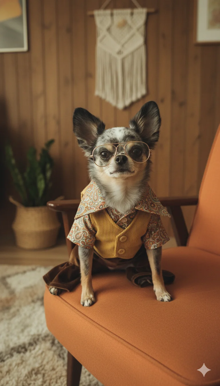 <한글번역 - [빈티지 패션 인물 사진 또는 who], 후지필름 X-T4 (XF 56mm f/1.2 R 렌즈 사용), 빈티지하고 향수를 불러일으키는 분위기, 따뜻한 필름 그레인, 바랜 색감, 복고풍 스타일링, 1970년대 미학>