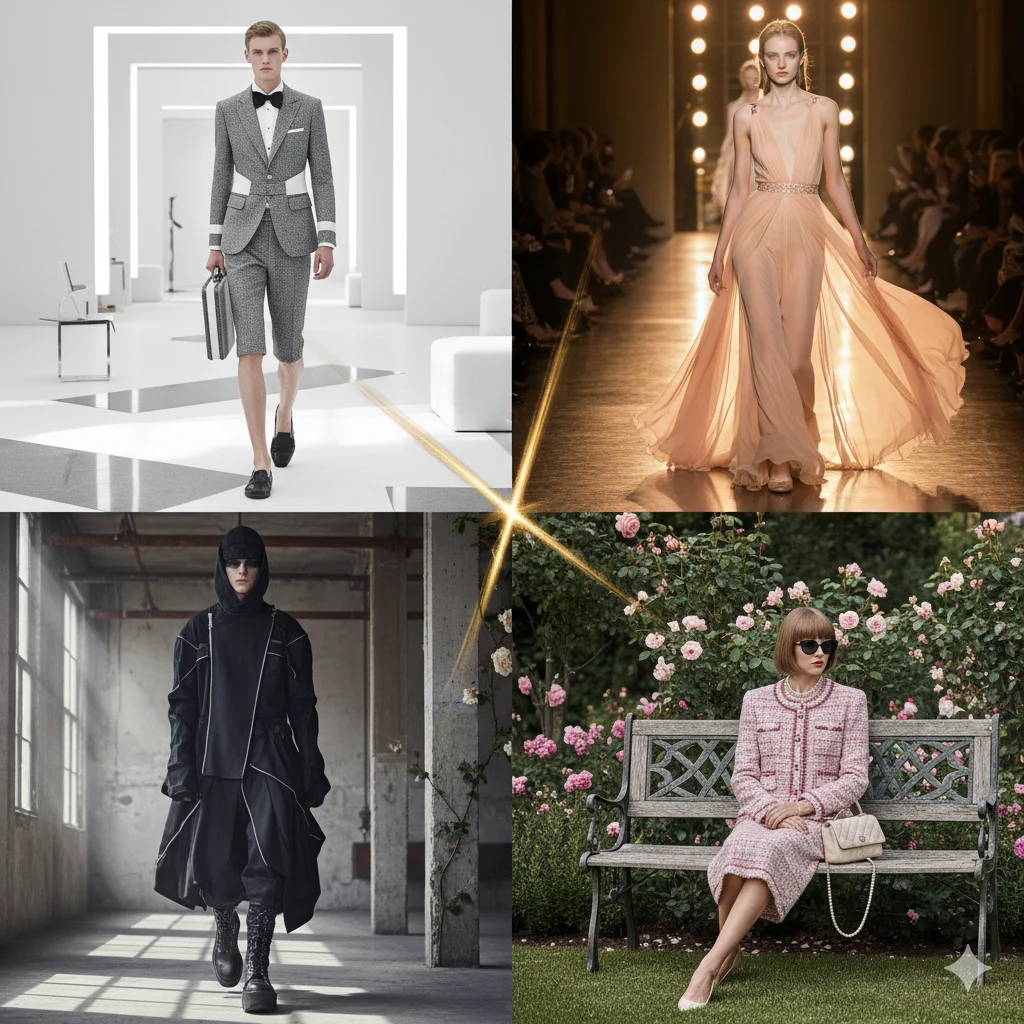- Chanel (샤넬): 클래식 트위드와 프렌치 시크의 정수를 담습니다. 여성의 우아함과 실용성을 동시에 추구했던 가브리엘 샤넬의 정신이 담긴 스타일입니다. 당시 여성들을 코르셋에서 해방시키고자 했던 그의 철학처럼, 실루엣은 편안하면서도 우아함을 잃지 않습니다.