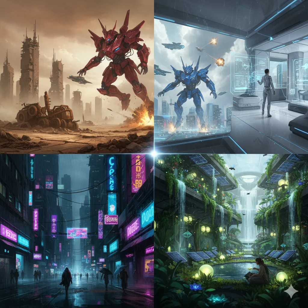 이처럼 미래 기술 관련 용어를 활용하면 AI는 더욱 구체적이고 전문적인 이미지를 생성합니다.
