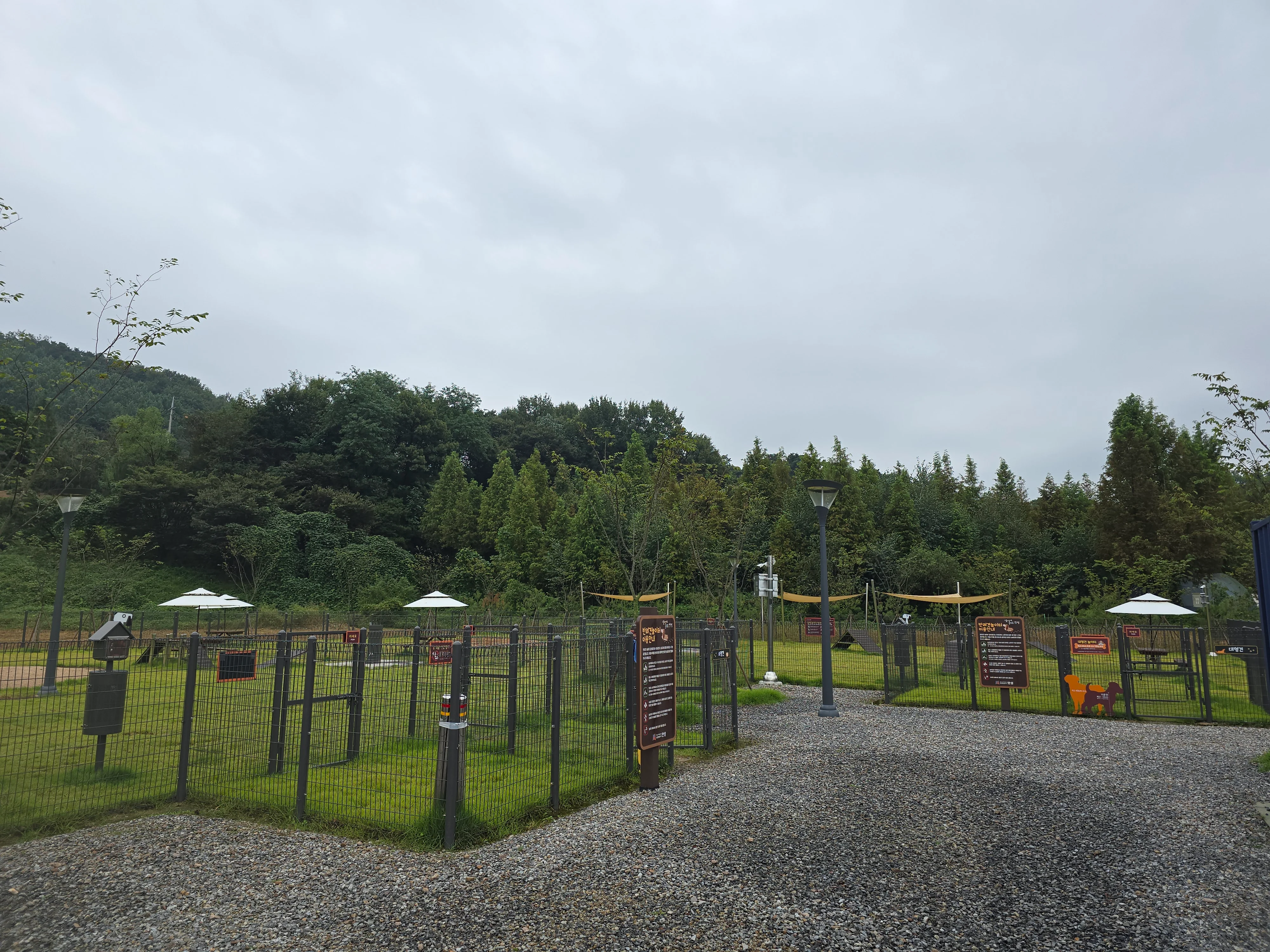 같이파크는 반려견뿐만 아니라 보호자들을 위한 시설도 잘 갖추고 있습니다. 음수대, 배변함, 파라솔, 벤치, 쉼터, 그늘목, 피크닉 테이블 등이 마련되어 있어, 보호자들도 편안하게 쉴 수 있도록 배려한 흔적이 보였습니다. 특히 그늘막과 테이블은 날씨가 좋은 날 피크닉을 즐기기에도 좋아 보입니다.