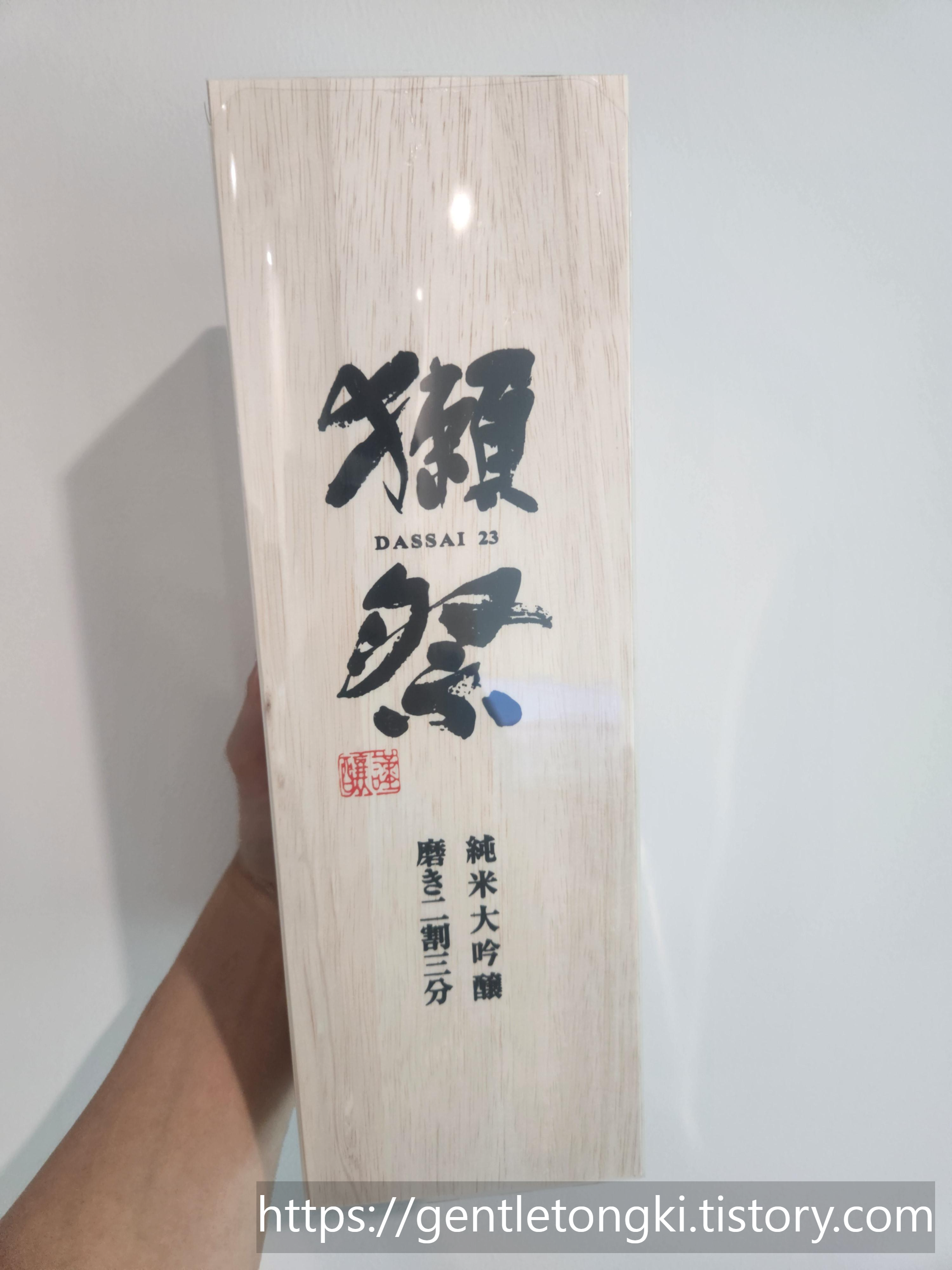 고급스러운 나무 케이스포장된 닷사이 23의 모습은 왜 이 술이 프리미엄 사케로 불리는지 시각적으로 보여줍니다.