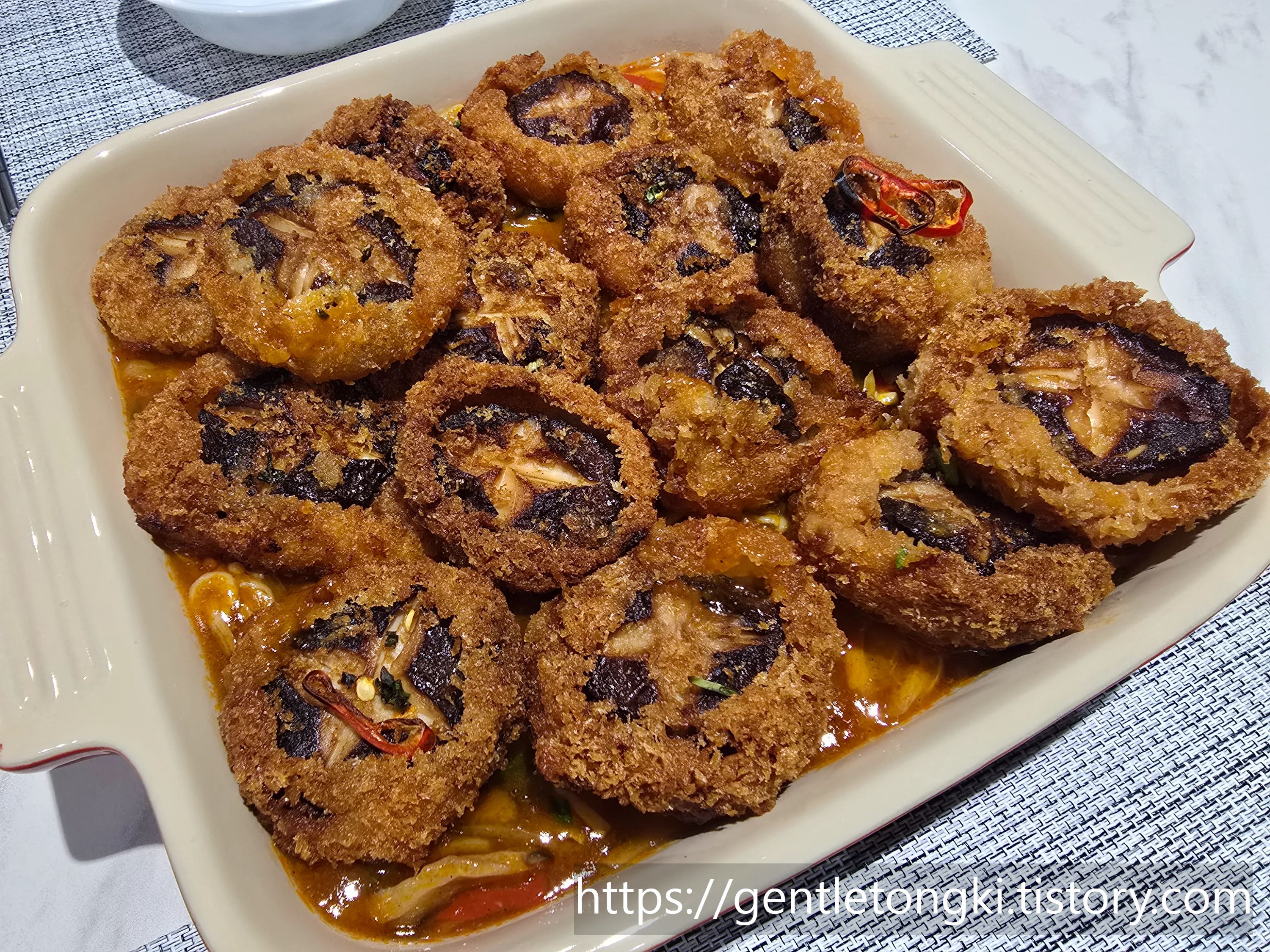 즉, 표고버섯 사이에 다진 새우 살을 꽉 채워 튀겨낸 뒤, 어향 소스에 버무려낸 정성이 가득 들어간 고급 중식 요리입니다.