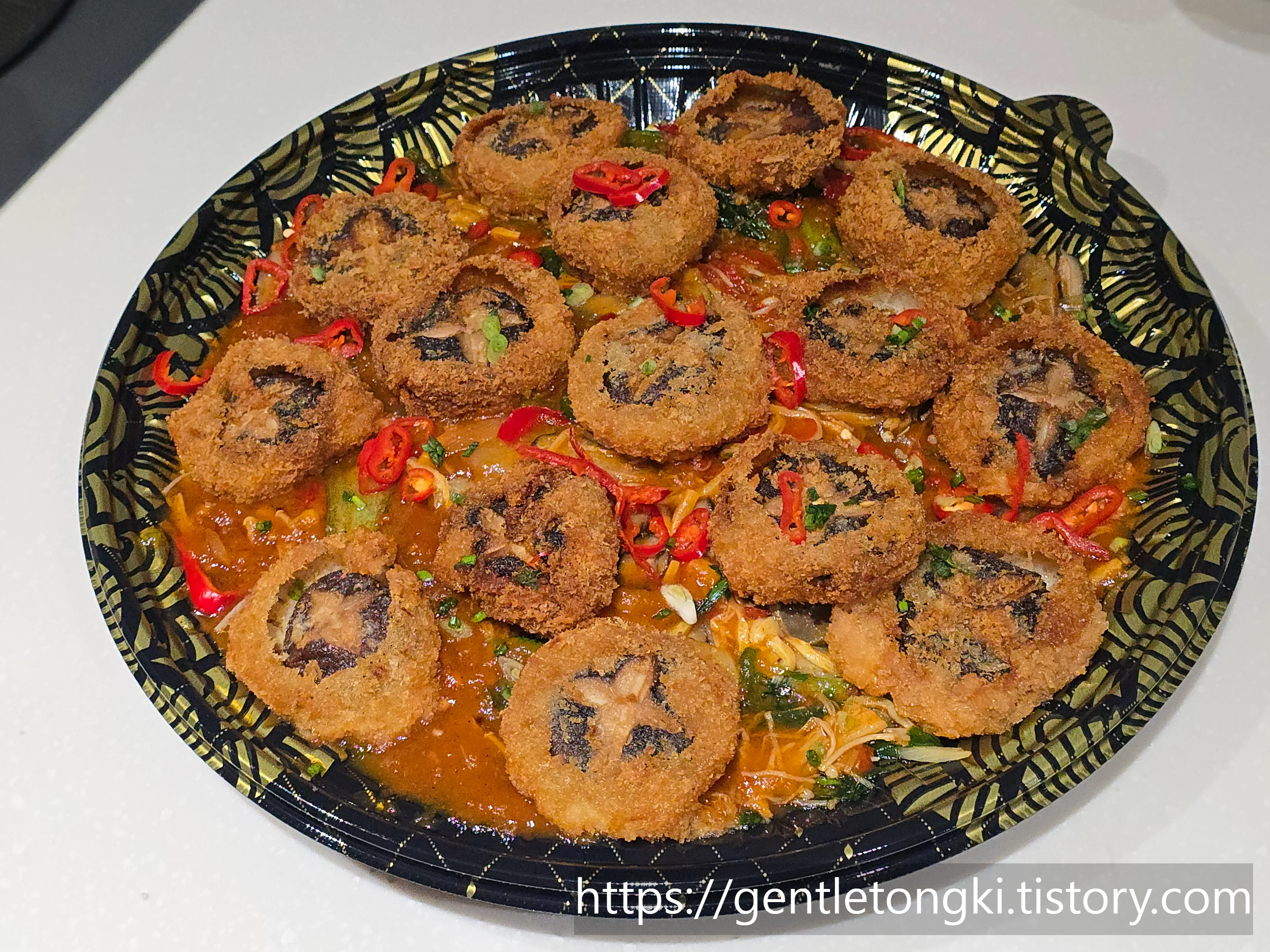 정성껏 데워낸 어향동고를 드디어 한 입 먹어보았습니다. 전체적인 맛은 만족스럽습니다. 에어프라이어를 활용한 덕분에 표고의 맛이 바삭한 식감과 어울어져 매우 만족스러웠고, 표고 안에 꽉 차 있는 내용물도 표고와 어울어져 맛있었습니다. 표고의 진한 풍향과 탱글탱글한 새우 살의 식감이 어향 소스의 매콤함과 아주 잘 어우러집니다.
