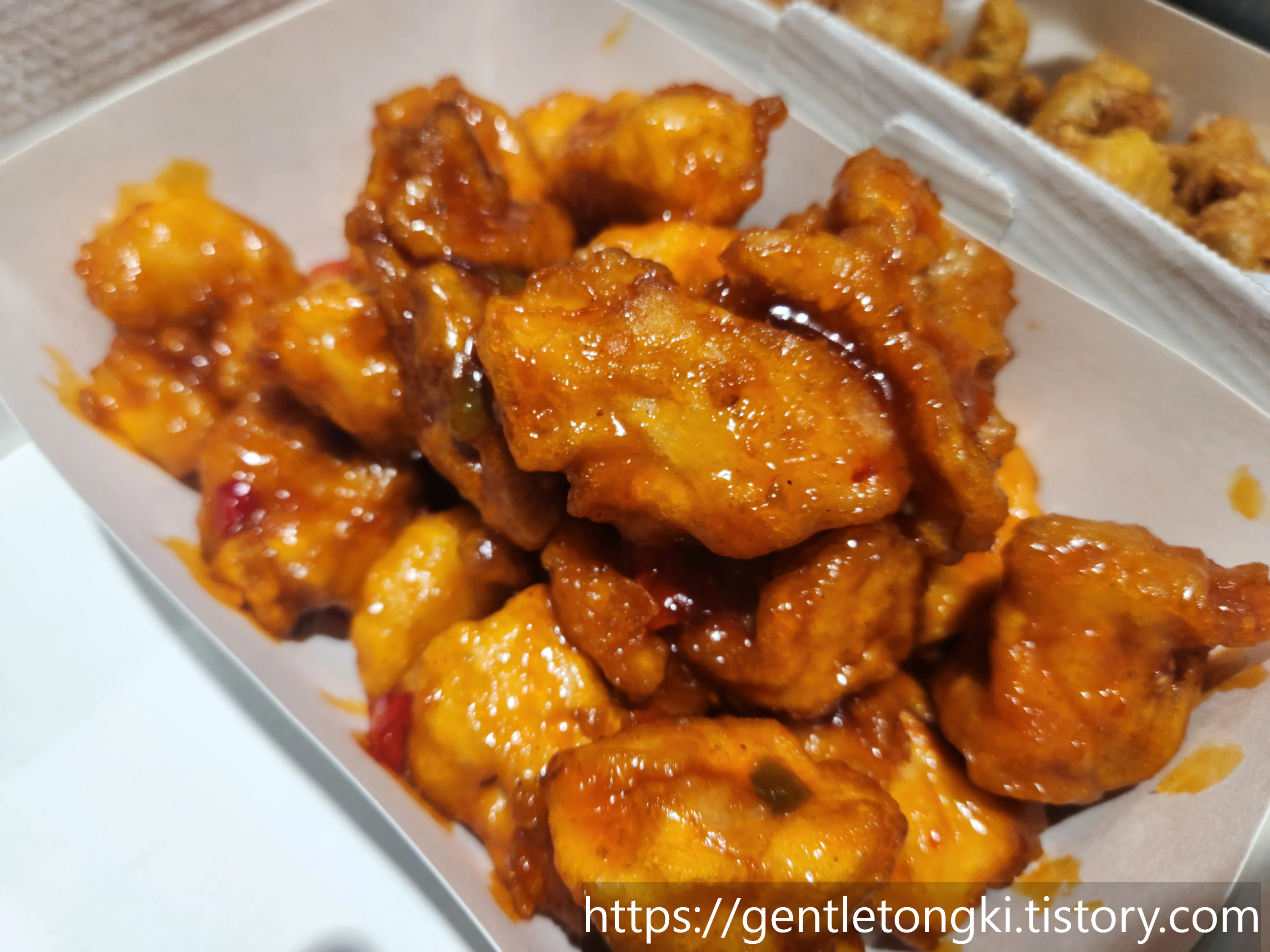 특히 호식이 치킨은 순살치킨이 개인적으로 선호하는 퍽퍽살이기에 이런 양념은 치킨 내부까지 전해질리 만무하고, 과연 치킨과 새우가 어울리는 조합이었느냐도 의문이었기 때문입니다. 뭔가 치킨과 양념이 따로 노는 느낌? 중화풍 소스라면 고기 깊숙이 맛이 배거나 튀김옷과 소스가 하나가 되는 눅진함이 있어야 하는데, 겉도는 소스가 퍽퍽한 살코기를 보완해주지 못하는 점이 못내 아쉬웠습니다.