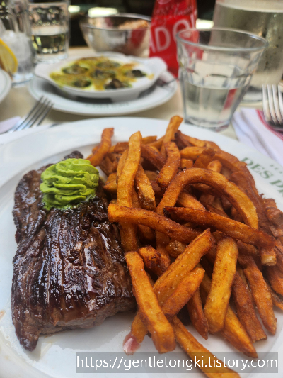 메인 요리인 스테이크는 두툼한 두께와 함께 육즙 가득한 맛이 일품이었습니다. 아주 특별한 맛은 아니었지만, 파리의 분위기 속에서 즐기는 식사는 그 자체로 충분히 만족스러웠습니다. 함께 나온 바삭한 감자튀김은 스테이크의 맛을 더욱 돋보이게 해주었습니다.