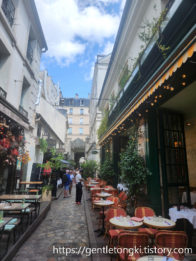 꾸르 뒤 코메르스 생 앙드레 골목의 전경. 양 옆으로 늘어선 레스토랑의 야외 테이블이 파리의 고풍스러운 분위기를 더합니다.
