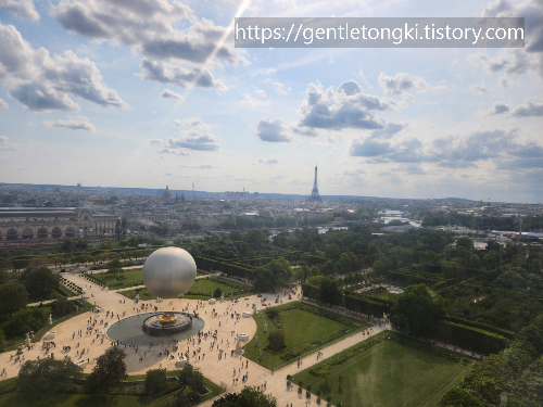 파리 시내와 멀리 보이는 에펠탑, 그리고 아래 푸른 공원이 어우러져 아름다운 풍경을 선사합니다.