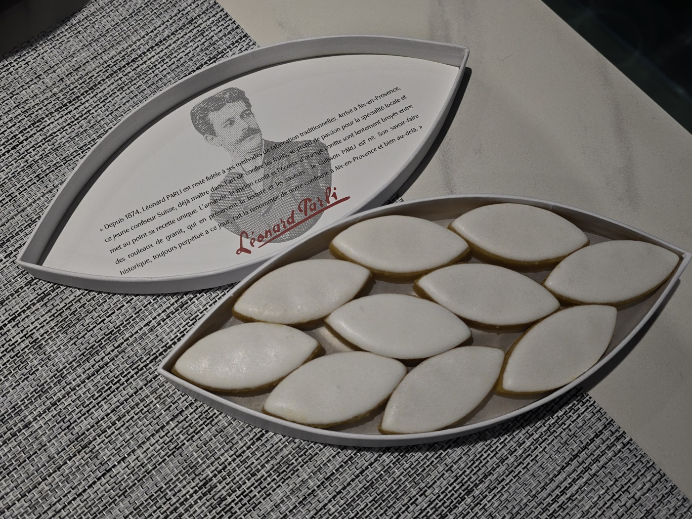 칼리쏭은 프랑스 남부 프로방스 지방의 엑상프로방스(Aix-en-Provence)를 대표하는 전통 과자입니다. 15세기 중세 시대부터 만들어졌다는 설이 있으며, 그 모양이 아몬드나 작은 배를 닮았다고 하여 '작은 배'라는 뜻의 라틴어 'calisson'에서 유래되었다고 합니다. 아몬드 가루와 멜론 설탕 절임, 오렌지 껍질 등을 주재료로 하여 만들어지며, 겉에는 얇은 설탕 시럽 막이 코팅되어 있습니다.